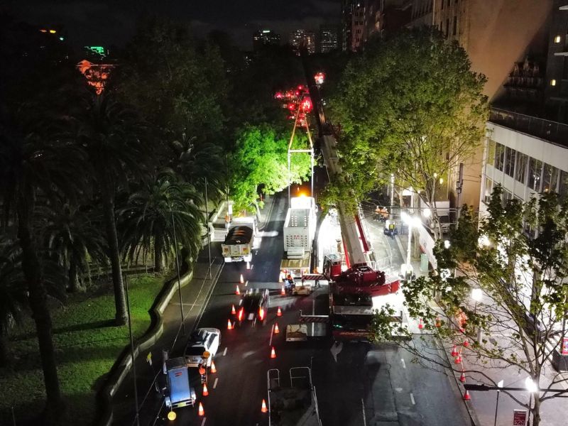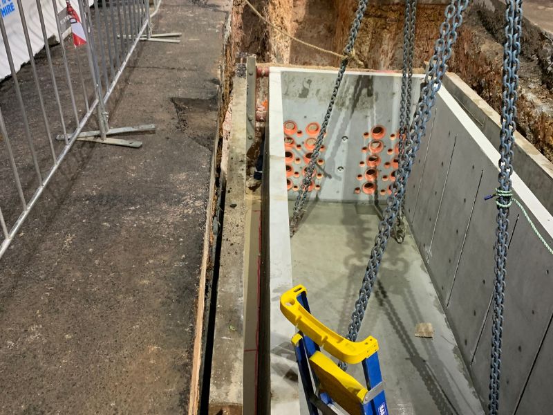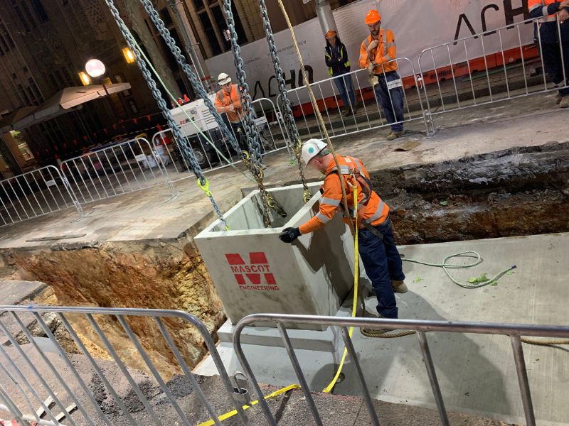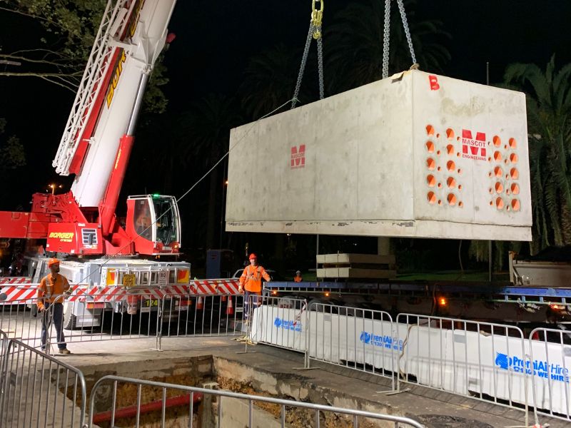 The Mascot logistics team worked closely with our client to coordinate the delivery of this custom precast Coreworx Joint Bay to Sydney’s CBD. With a small window for delivery and installation, this 30t custom precast cable pit was delivered from our manufacturing site to Macquarie Street (just opposite the Cahill Expressway) at 7pm on a Saturday night. Timing was critical to ensure a smooth installation with the booked crane and crew.