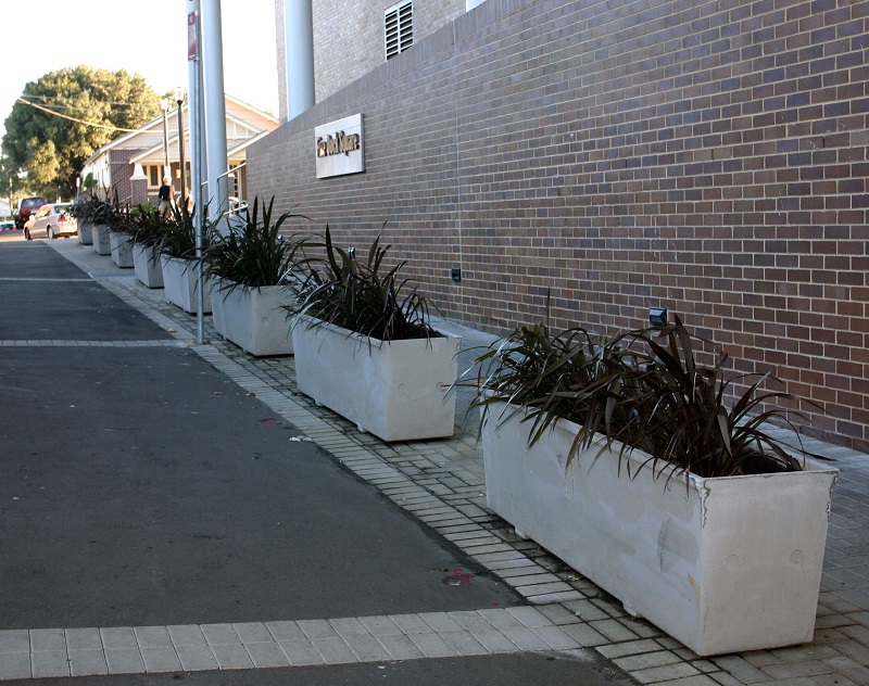 Our lightweight concrete planters are ideal for public outdoor spaces and shared vehicle and pedestrian zones, like this one in Sydney’s Inner West suburb of Five Dock.  Creating a natural walkway for pedestrians adjacent to the street, the planter boxes create a safe entrance to the Council Library and shopping centre.