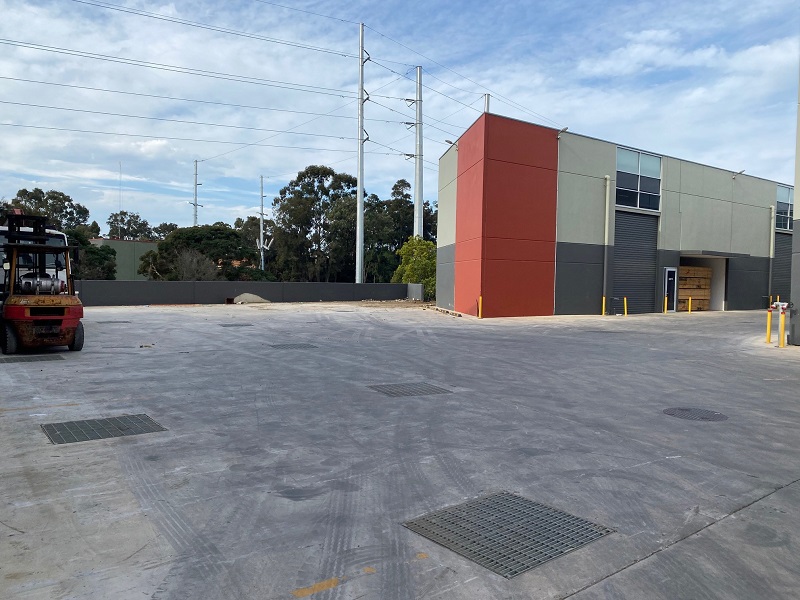 Designed with the plumbing contractor in mind, Mascot GRC Drainage Pits are simple and easy to install. Pipe entries can be made on site with a ball pein hammer in any location or size – you’re not limited to a knockout panel like those found in traditional concrete pits. Mascot GRC Pits are strong though lightweight allowing them to be used as an alternative to 100mm wall pits. Given the industrial nature of this project, heavy duty galvanised mild steel grates and frames have been installed. The large opening of these grates perform exceptionally well collecting rainwater in installations like these with such a large concreted area.