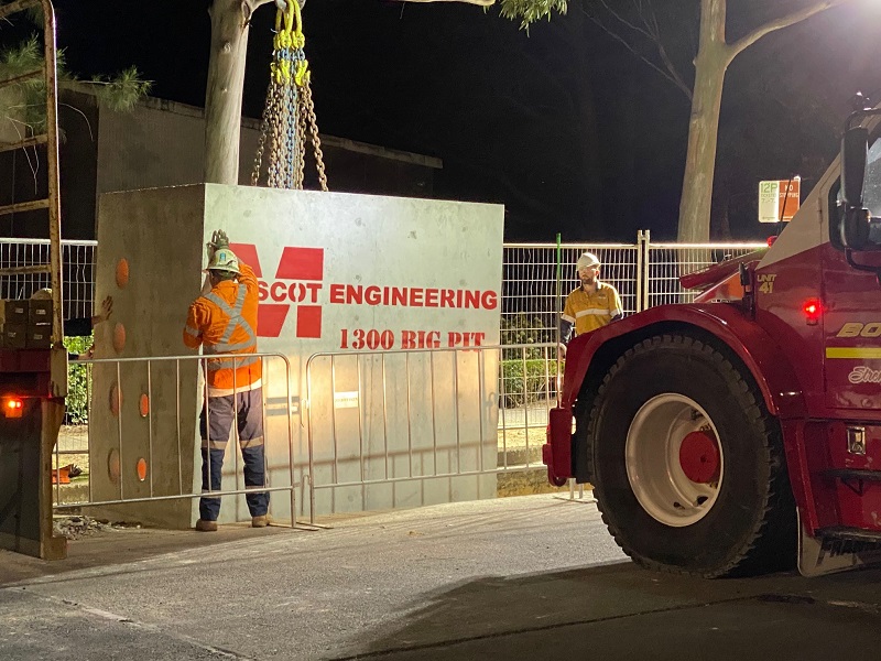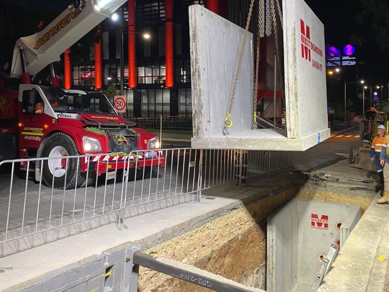 This custom segmented (Mascot patent) precast Joint Bay is a 33kv Feeder installed to increase the power to a Macquarie Telecom Date Centre.  We worked closely with the contractor to design and construct a cable joint bay that could not only match the clients requirements but also be installed quickly during the evening to avoid disruption.  Located in the middle of a busy road, our logistics team planned for two semi-trailers to arrive at 10pm to meet the crane and install team.