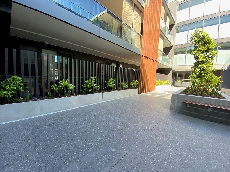 Complimenting the stone and timber, Mascot lightweight concrete planters have been chosen to provide a ‘green ring’ around the area. Supplied in a raw concrete finish, our trough planters are manufactured from Glass Reinforced Concrete (GRC). Mascot GRC is a lightweight concrete using high strength fibreglass rather than steel as reinforcement resulting in a product the is significantly lighter – reducing freight and installation costs.