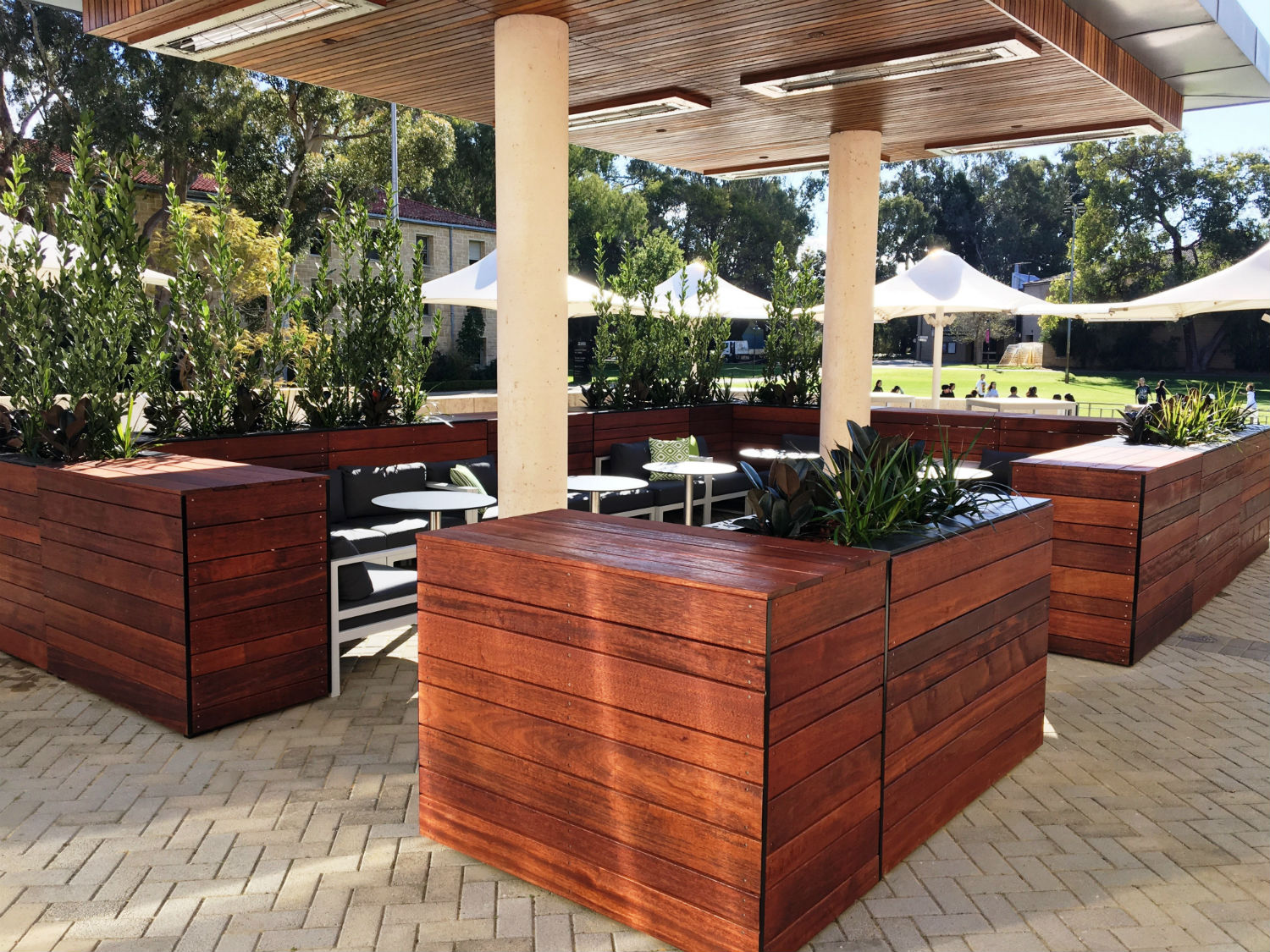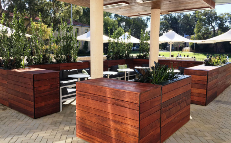 A project recently completed by Western Projects for the University Club of WA beautifully demonstrates how our planter boxes can be used as both a design feature, as well as a strong, but lightweight solution for our clients landscaping needs. In this project, Mascot’s Glass Reinforced Concrete planter boxes were clad in timber panelling to integrate seamlessly with the overall design for the outdoor area of the club. Our planter boxes not only served as support for greenery in the space, they also provided structural separation for the outdoor entertaining area.